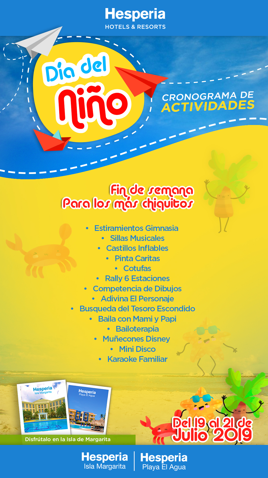 La diversión apenas comienza, pues en Hesperia Isla Margarita y en Hesperia Playa El Agua nuestro equipo de animación ya tiene todo preparado para recibir a los niños y hacerlo vivir una experiencia maravillosa, con variadas actividades.